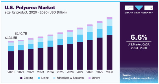 The US polyurea market is experiencing continuous development; the evolution for 2020–2023 and the prediction up to 2030 are presented in Figure 1 [11].