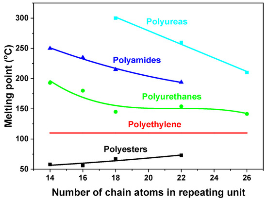 Figure 2 depicts the melting point dependence on the number of carbon atoms in the repeating unit of various types of polymers capable of forming hydrogen bonds [1]. Polyurea present a higher melting point that can be explained by the hydrogen intermolecular bonding between the polymer chains.