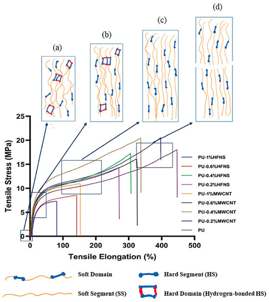 Predictive design of PU materials, particularly with a focus on structure, becomes difficult due to the likelihood of both high-pressure and high-strain-rate effects in response to an explosion or bullet impact [70]. According to Leite et al. [71], ideally, the maximum elongation should be as high as possible to allow for deformation and energy dissipation (Figure 4). The stress–strain (elongation) curve presents two domains, an elastic region and a plastic zone. In the elastic zone, the application of stress leads to continuous deformation with recovery when the stress is removed. In the plastic zone, the recovery does not happen when the stress is removed. After entering the plastic stage, the continuous application of the stress leads to the material breaks [72].
