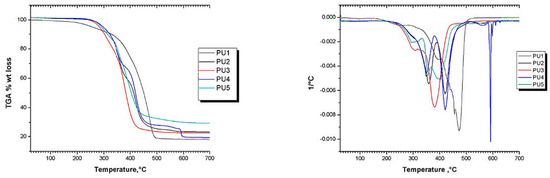 TGA analyses of polyurea samples (heating rate 10 °C/min, under nitrogen) (from [83]).