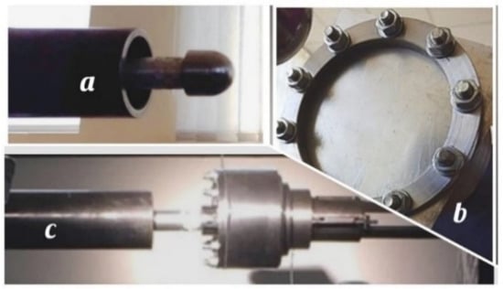 Hopkinson bar setup for experimental testing of the polyurea–polyurethane–MWCNTs-nanocomposite-coated aluminum plates in dynamic regime: (a) spherical head projectile; (b) sample before the experiment (coated on the backside with polyurea (PU) or polyurea–polyurethane–MWCNTs nanocomposite (PU-NC)); (c) image captured during the experiment, at the moment of the impact of the projectile on the sample (from [80]).