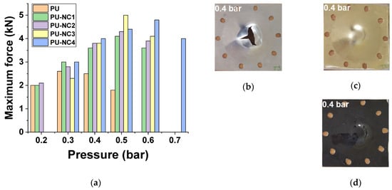 Results of Hopkinson bar experiments: (a) maximum force values obtained during the impact—Hopkinson bar tests; (b) neat metal; (c) polyurea-coated metal; (d) polyurea–MWCNT-coated metal (from [80]).