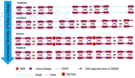 The chain extender is usually a molecule with a low molecular weight that has the role of increasing the molecular weight of the polyurea by establishing strong bonds between the two types of segments [58]. In addition, it forces the urea bonds closer together and thus facilitates the formation of hydrogen bonds between the hard segments [21,59,60].