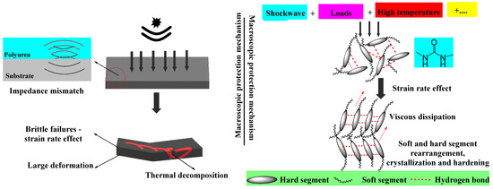 Relatively recent studies [21,22] sustain that the explosion shock wave determines a reordering at a molecular level; thus, the molecular rearrangement and neutralization appear to be events dominated by energy dissipation during impact. This arrangement process is associated with a viscoelastic dissipation of the deformation rate [2], leading to improved mechanical properties and diminished effects of the stress rate and impedance mismatch between support and polymer coating [23] (Scheme 2).