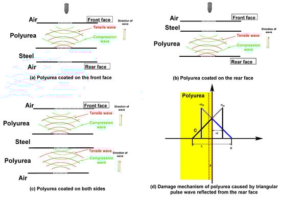 A significant amount of research was conducted on the energy dissipation mechanism of polyurea coatings under the blast overpressure effect. However, there is a relatively small number of published papers that explore the behavior of polyurea-coated metallic substrates subjected to localized loads generated from bullet impact. When subjected to high-velocity impact, polyurea coatings could improve the penetration/fragmentation resistance of the underlying substrate, depending on the following parameters: thickness of the polyurea coating [24], number of layers and configuration of the composite, dissipation of the localized shock wave (Scheme 3) through multiple reflections as it traverses the composite [25], Tg and a viscoelastic transition of the elastomer to its glassy state due to the localized loading resulting from the impact of a high-speed projectile [23], dynamics of hard/soft segments and hydrogen bonding [26,27], etc.
