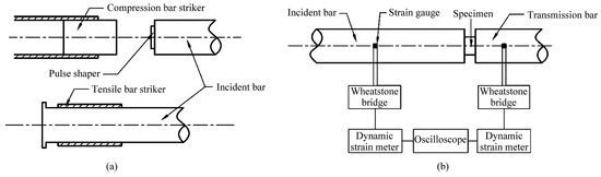 The illustration of a split Hopkinson pressure bar setup: (a) loading; (b) incident and transmission bar and measurement system [85].