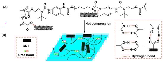 Schematic representation of hydrogen bond formation in polyurea and hard/soft segments, respectively.