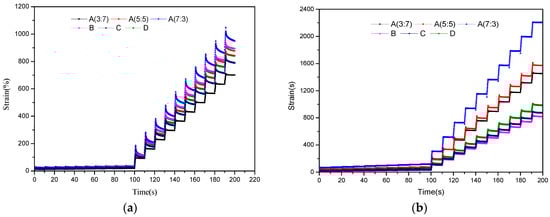 The time–strain curve of the sample at the bottom of the SBR/PP composite-modified asphalt separation tube is shown in Figure 2b. It displayed that the strain variation amplitude of the modified asphalt at the bottom of sample A (7:3) was significantly larger than that of other samples. When a compatibilizer or a crosslinking agent was used, the strain of the modified asphalt in the bottom position of the separation tube was relatively reduced.