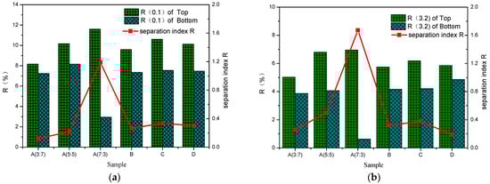 In addition, rheological property testing has been proven to be an effective method for evaluating storage stability, so a multi-stress creep evaluation test can be performed on the modified asphalt on the top and bottom of the sample to evaluate the thermal stability of modified asphalt. Separation tests of SBR/PP composite-modified asphalt were evaluated according to JTG-E20-2011 []. Tubes with modified asphalt were stored in ovens at 163 °C for 48 h, then frozen at −5 °C for 5 h before being divided into three sections. The softening point difference and separation index of the upper and lower sections were tested []. The separation index is defined as follows: