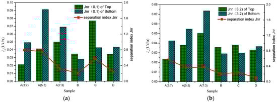 To sum up, the time–strain curves of the SBR/PP-modified asphalt at the top and bottom of the separation tube are obviously different, which is mainly due to the difference in the compatibility between asphalt and SBR/PP thermoplastic elastomer with different proportion design, resulting in extra thermal stability of SBR/PP composite-modified asphalt []. Therefore, it is necessary to further analyze its performance through the recovery percentage R and the unrecoverable creep compliance Jnr.