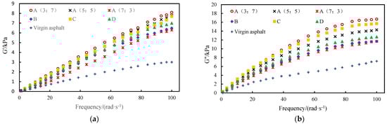 Based on the frequency scanning test, the elastic modulus G′ and viscous modulus G″ of SBR/PP composite-modified asphalt were analyzed. The test results are shown in Figure 2. It can be seen from Figure 6 that, with the increase of load frequency, the elastic modulus and viscous modulus of SBR/PP composite-modified asphalt gradually increase, indicating that its high-temperature deformation resistance will be improved under high-frequency load. This phenomenon brings to mind examples from actual traffic scenarios, such as asphalt pavements near road intersections and bus stops, as these are more prone to rutting or deformation in China. The main reason for this is the low speed of vehicles, the long duration of driving loads, and the increased contact time and area between vehicles’ tires and the asphalt pavement, which leads to greater deformation of the pavement material.