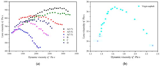 The Cole–Cole diagram is an important method to study the rheological behavior of blended polymers. It represents dynamic viscosity η″ (η″ = G′/ω) and loss viscosity η′ (η′ = G″/ω), allowing the relationship between the rheological properties of different polymer composite-modified structures to be studied. Different curve forms represent a mechanism of relaxation. The relaxation phenomenon in the high-frequency region is mainly due to the relaxation of the continuous phase, and in the low-frequency region it is primarily due to the variability of the dispersed phase. This reveals information on relaxation mechanism and blending uniformity [,]. Therefore, in order to better evaluate the compatibility of SBR/PP thermoplastic elastomer and asphalt, the test analyzes the compatibility characteristics of modified asphalt through the study of Cole–Cole diagram types, and the Cole–Cole diagram of general homogeneous system shows a semicircular arc curve. The Cole–Cole diagram of the two-phase system shows an incomplete semicircular arc curve.