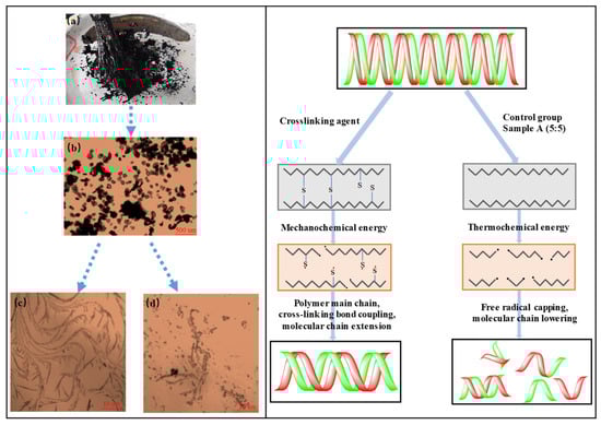 - The SBR powder and PP granules were weighed according to the proportioning design, respectively, mixed in a mixer for 1 min, and then added to an appropriate amount of compatibilizer, a crosslinking agent and an auxiliary agent for blending; finally, the blend was added to a screw extruder for extrusion. The temperature of the extruder feeding port was set to 180 °C, the temperature of the die head was set to 190 °C, and the rotational speed of the screw was 150 r/min to obtain the SBR/PP thermoplastic elastomer. In order to improve the dispersion and swelling of SBR/PP thermoplastic elastomer in asphalt, it is ground by a rubber pulverizer []. The effect is shown in Figure 1. It can be observed through the general optical micrograph microscope that the surface of the SBR/PP thermoplastic elastomer particles is rough, the shape is irregular, and the SBR and PP are evenly mixed. SBR/PP elastomers are not white, but off-white (shown in Figure 1a). It looks off-white mainly due to the use of auxiliary lighting during the shooting process, making the overall color bright (or off-white). In this study, the average particle size of SBR particles is approximately 20 mesh. According to some relevant studies [,,], PP was calculated and revealed to exhibit isotactic configuration, with a molecular weight of 40,000 g/mol; this constitutes over 95% of the entire polymer content.