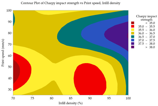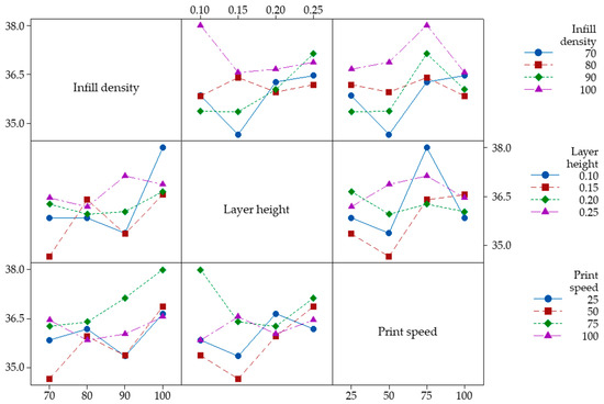 - Interaction plots demonstrated strong interactions between parameters, especially emphasizing the positive impact of 100% infill density and 75 mm/s print speed on impact strength.