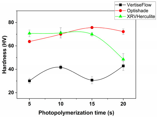 Vickers hardness results of the three dental materials after four polymerization intervals. Herculite and OptiShade reach the maximum hardness after 10 s and 15 s of polymerization, respectively, while VertiseFlow has an unusual behavior: the hardness value drops significantly at 15 s of curing compared to the neighboring values. This abnormal behavior could be due to the presence of YbF3, which reacts with the cured methacrylate polymer chains, breaking their bonds and weakening the structure.