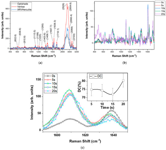 (a) Raman spectra at 532 nm for non-cured composites after luminescence correction; (b) Raman spectra for XRV Herculite samples during curing; (c) details of Raman spectra for XRV Herculite samples during curing showing 1608 and 1638 cm−1 bands. The inset shows the calculated degree of conversion.