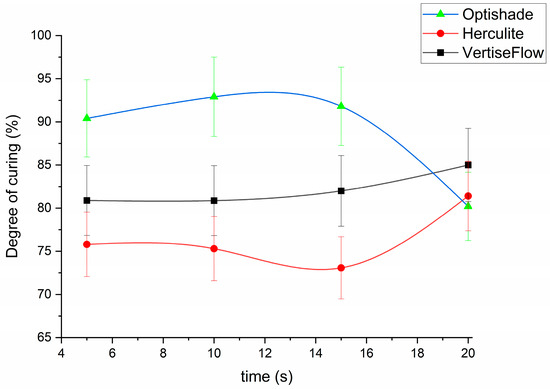The highest DC value was calculated for OptiShade, which also indicated a stable polymerization process in time. At 20 s, the curing was slightly decreased because the reaction rate slowed due to shrinkage and breaking of the surface lattice (Figure 3) [40]. This high stability as a function of curing time is given by its composition of 80% nano-sized filler and 20% methacrylate monomer. Increasing the concentration of monomer to 41%, as it is the case of Herculite induces a curious behavior: the DC decreases from 74.8% (at 5 s curing time) to 72% (at 15 s) and increases sharply to 80.4% (at 20 s curing time). These results could be explained by the high content of inert mineral fillers, which interfere with the linear polymerization process of the resin [40,41]. By decreasing the amount of methacrylate in the dental material to 30% as it is the case for VertiseFlow, the DC value showed that the polymerization process was constant for the first 10 s, after which it increased slowly to 85%.