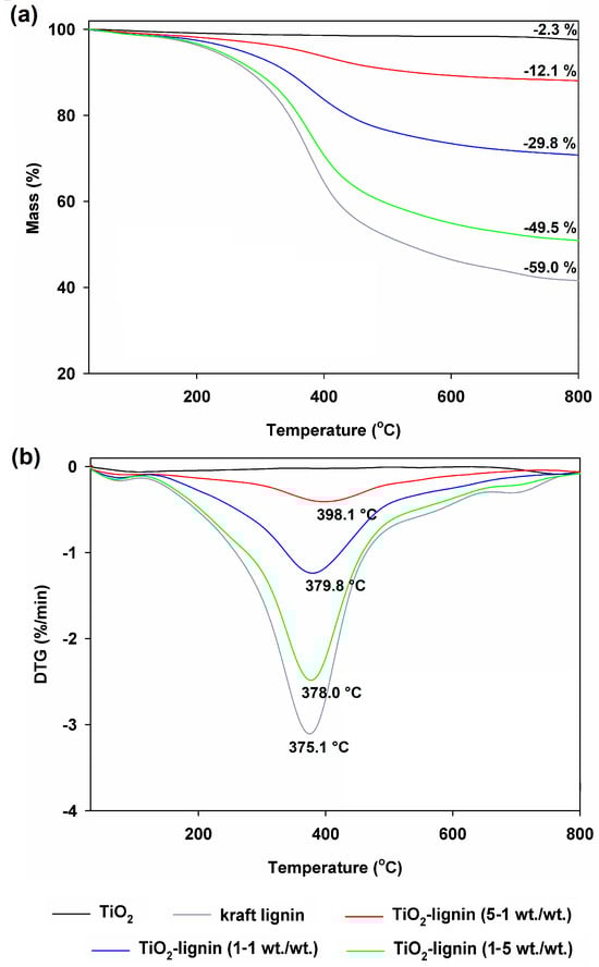 Thermogravimetric (TGA) curves (a) and derivative thermogravimetric (DTG) curves (b) of TiO2–lignin hybrids and pristine components (titanium dioxide and kraft lignin).