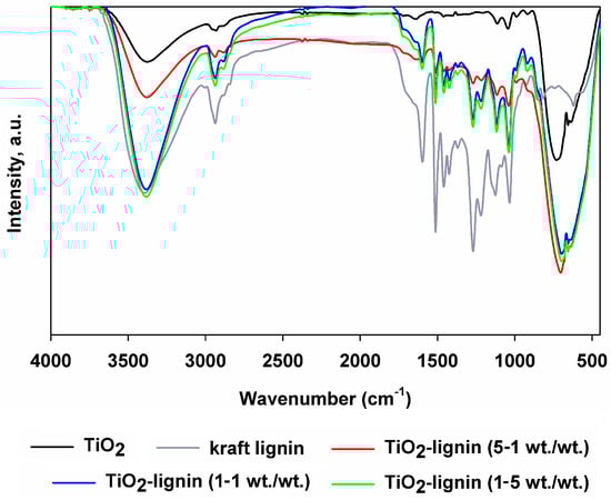 To determine the functional groups present in the structure of the components used and the hybrid systems obtained with their participation, Fourier-transform infrared spectroscopy was used (see Figure 3). In the case of the inorganic component, a band at the wavenumber of 3400 cm−1 was observed, originating from the stretching vibrations of O-H groups, most likely related to physically bound water molecules on the surface of the photocatalyst []. However, the band with a maximum in the range of 785–500 cm−1 is associated with stretching vibrations of the Ti-O and Ti-O-Ti groups [,]. The remaining visible bands in the FTIR spectrum of titanium dioxide most likely come from impurities remaining after the TiO2 synthesis process. The next analyzed infrared spectrum was that obtained for kraft lignin. Typical bands of functional groups present in the structure of this biopolymer were observed in earlier works [,,,,]. Namely, the band at the wavenumber 3423 cm−1 originates from the stretching vibrations of hydroxyl groups. Subsequently, a band of medium intensity was observed with a maximum at 2937 cm−1 and a band of low intensity at 2883 cm−1, characteristic of the stretching vibrations of C-H groups occurring in methyl and methylene groups, respectively. The low-intensity band at the wavenumber 2843 cm−1 is most likely related to the vibrations of the -O-CH3 groups of methoxy groups. At 1680 cm−1, a band resulting from the vibrations of C=O groups is visible. The next sharp bands with maxima at wavenumbers 1595 cm−1, 1510 cm−1, 1458 cm−1, and 1423 cm−1 come from the aromatic vibrations of C-C and C=C groups and are related to the presence of aromatic rings in the structure of kraft lignin. Due to the stretching vibrations of the C-O groups, a band with a maximum of 1267 cm−1 is visible. The next two bands at the wavenumbers 1367 cm−1 and 1217 cm−1 are characteristic of the bending vibrations of the Ar-OH groups of phenolic groups and the stretching vibrations of the C-O groups of carbons present in aliphatic chains and aromatic rings.