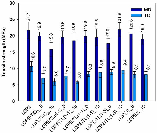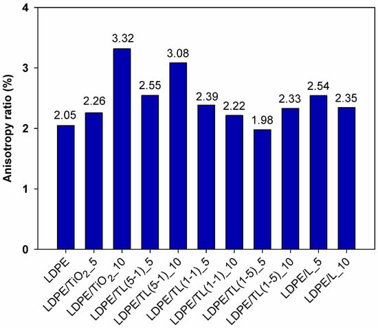 The tensile properties of LDPE and LDPE/TiO2–lignin composites obtained from thin strips with the thickness in the range of 80–150 µm and elongated at a constant rate are reported in Figure 4 and Figure 5. For packaging-like materials, important properties include the ultimate strength, elongation at break, and the anisotropy ratio, which is related to mechanical properties in machine and transverse directions. Comparing the ultimate tensile strength for samples cut in the machine direction, the highest values were noticed for LDPE and for the composite with 10% by wt. of a hybrid structure with a 1–5 wt./wt. ratio. Among tested composites, only the sample with a 10% load of TiO2 revealed a noticeable decrease in tensile strength, which could be explained as an agglomerate factor or rigid filler loading factor. It can also be observed that the values of tensile strength of the samples cut out from the thin sheets in the transverse direction (TD) are over two times lower compared to those taken along the extrusion direction (MD). This feature comes from the preferred orientation during film extrusion and, in this case, is also promoted by the strong uniaxial drawing of the polymer macromolecules during film formation using the chill-roll winding method. Therefore, the anisotropy ratio (AR) of the tested films is a very important parameter that provides additional information about the products that are produced at the cast line; the results are summarized in Figure 6.