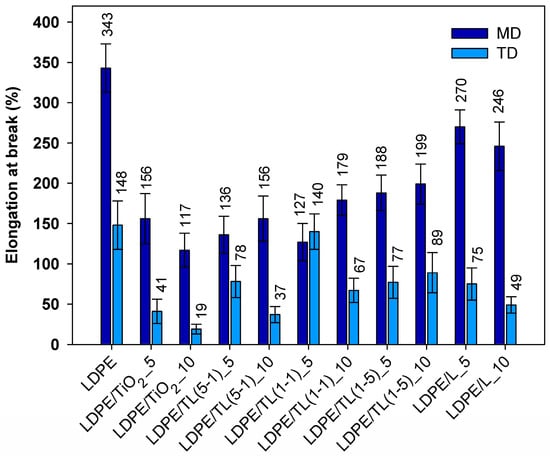 For two kinds of materials, the AR factor is close to the 2% value; these samples include neat LDPE and its composite with the 5% hybrid filler with a 1–5 wt./wt. ratio. The highest anisotropy ratio was read out for composites with a 10% load of TiO2 and a 10% load of hybrid filler with a 5-1 wt./wt. ratio. Adding fillers, in which titanium dioxide is the predominant additive, reduces the ability of polyethylene to orient, which leads to a reduction in the strength of TD samples compared to those of PE. It can be assumed that, from a practical point of view, the aforementioned composites are, for example, less suitable for thermoforming processes and should provide uneven tensile deformation. As a result, thermoformed parts are likely to exhibit high mechanical anisotropy. The highest value of elongation at break is manifested by the LDPE sample (Figure 5). Out of all of the tested composites, the best elongation at break was found in two samples where only lignin was incorporated. This behavior may be related to the action of lignin as a sliding agent. Low-molecular-weight lignin chines can penetrate between entangled polymer molecules and promote their mobility. Short lignin molecules dispersed in the polyethylene structure can increase the mobility of polymer chains, and the elongation in this case is not aggravated by lignin inclusions. Such a positive effect on lignin action was also noticed in polypropylene/lignin composites [].