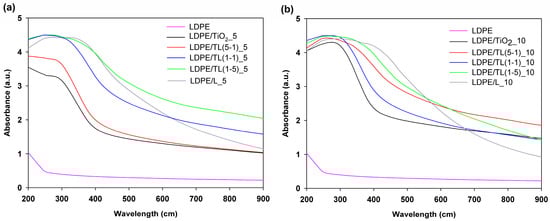 UV–Vis spectra of LDPE-based composite films: (a) at a 5% by wt. concentration of the filler and (b) at a 10% by wt. filler presence.
