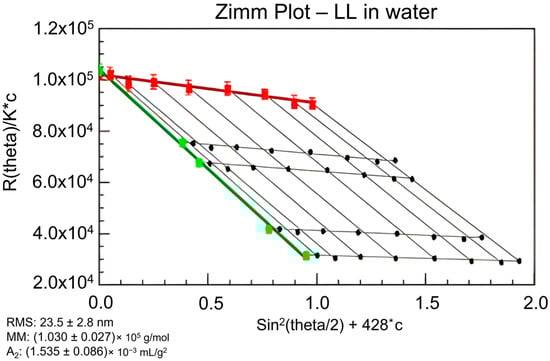 Zimm plot of unlyophilized lignin in water using Debye formalism. Black dots represent different concentrations of lignin measured at each angle. The green extrapolation is to zero concentration. The red extrapolation is to zero scattering angle. Reprinted from []. Copyright 2005, with permission from Elsevier.