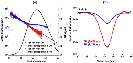 SEC–MALS analysis of kraft lignin (Indulin AT): (a) chromatogram displaying LM vs. FM extrapolation. (b) Forward monitoring (FM) displaying absorbance in flow-cell at two different wavelengths. Reprinted from [].