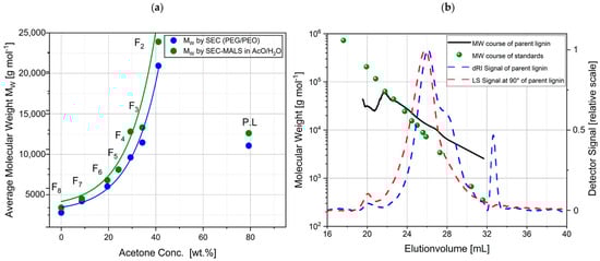 (a) Lignin fraction’s MW determined via SEC (blue) and SEC–MALS (green). (b) SEC–MALS MW comparison of PEG and PEO standards vs. feedstock. Reprinted from [].