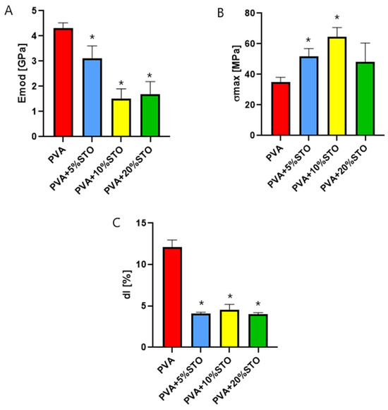 (A) the Young Modulus (Emod), (B) maximum tensile strength (σmax) and (C) elongation at break (dl) determined for films based on PVA, PVA + 5%STO, PVA + 10%STO, and PVA + 20%STO. * significantly different from PVA (p < 0.05).
