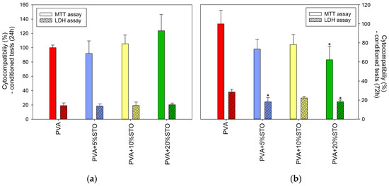 The addition of STO into PVA films up to 20% did not negatively affect their cyto-compatibility in a short incubation period (24 h) with prepared extracts, which is confirmed by a comparable MTT result and no increase in the released LDH (Figure 3a). However, longer incubation (72 h) showed that this modification had a slightly cytostatic effect on osteoblast (MTT assay: ~70–80% for PVA with 5% and 10%STO), especially relevant for higher STO content–PVA-20%STO (MTT ~60%) and considering that no significant increase in released LDH into the medium indicates no cytotoxicity (Figure 3b).