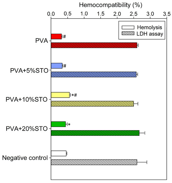 Strontium titanate nanoparticles may have biomedical applications as carriers for strontium ions, which actively support bone regeneration [39]. So far, various Sr components have been used, among others, in bioactive glasses [40], hydroxyapatite ceramics [41], and as a coating for titanium surfaces [42]. Moreover, Sr-containing materials hemo- and cyto-compatible were previously confirmed [43,44]. Furthermore, a number of studies, both in vitro and in vivo, have also shown that PVA is a highly biocompatible material [45]. Hence, the non-toxicity of our composites based on PVA with STO could be assumed, and improved cellular response could also be expected. However, results of hFOB compatibility consistent with the literature were obtained only for a shorter culture period (24 h), where the higher cell viability (with a positive trend with increasing STO concentration) compared to the unmodified control was found (up to 10%STO). Nevertheless, with a longer incubation period (72 h), the opposite effect was observed. Such a positive effect of PVA on the viability and proliferation of bone-like cells has been previously reported [46]. However, for PVA-STO, especially 20%, a cytostatic effect was noted (no increase in the LDH level was observed), which may be related to the material degradation during the cell culture. It was noticed in the literature that most of the research on the modification of biomaterials with strontium components did not use it in the nanometric form (such as in our work, ~100 nm diameter), which may also partially explain the differences in the obtained results. Further, it is also worth emphasizing that all films remained hemo-compatible, which is fully consistent with the reports of other researchers [43]. Therefore, based on the ISO 10993-5 standard [47] and the analysis of statistical significance, PVA film containing up to 10%STO may be considered biocompatible.