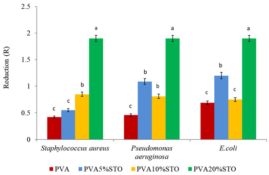 Biocidal properties of PVA/STO films. Different letters over the bars indicate a significant difference between means (p < 0.05).