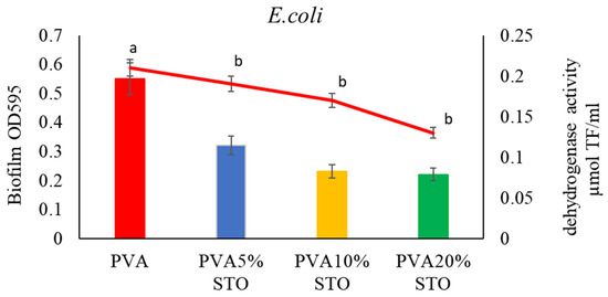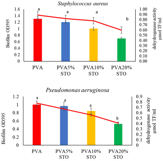 Biofilm abundance and respiratory activity on the surface of PVA/STO films. Columns were designated as biofilm and lines as dehydrogenase. Different letters over the bars indicate a significant difference between means (p < 0.05), ±SD (n = 3).