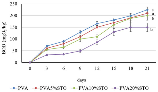 Biodegradation of PVA/STO as expressed in mgO2/kg compost. Different letters over the bars indicate a significant difference between means (p < 0.05), ±SD (n = 3).