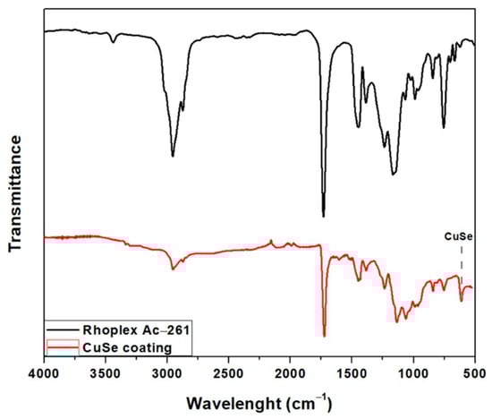 FTIR spectra of CuSe nanostructured coating and Rhoplex Ac-261 commercial resin.