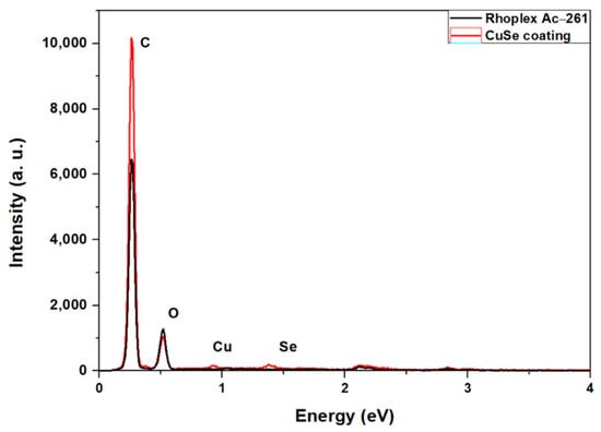 The spectrum of the nanostructured coating with CuSe nanoparticles turned out to be very similar; the main difference found is the peak localized at 611 cm−1, which is attributed to the bending vibrations of CuSe []. Modifications and shifts in the nanostructured CuSe coating spectrum compared to the Rhoplex Ac-261 spectrum are attributed to an interaction with CuSe-GA (see Section 2.1) nanoparticles. As reported, predominant groups of gum arabic can be shown in the spectrum of the modified nanoparticles [].
