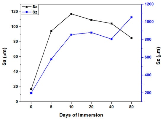 On the other hand, the maximum height obtained (Sz) exhibits a behavior similar to the previous one, which confirms having the maximum height at 10 days and after that, there is a decrease in both coatings.