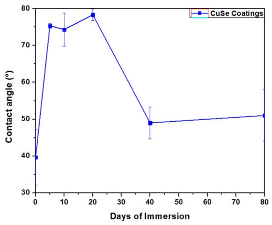 Figure 8 presents the contact angle measurements of CuSe nanostructured coatings. The measurement of the contact angle of the CuSe nanostructured coating without water immersion (0 days) was 39.6 degrees. At 5, 10, and 20 days, different values of 75, 74, and 78 degrees were observed. These results indicate that the changes obtained in the surface of the nanostructured CuSe coating by immersion tend to exhibit a decrease in their hydrophilic behavior. However, at 40 and 80 days, there is a decrease in the contact angle of 49 and 51 degrees, respectively, indicating that the hydrophilic character increases after 20 days of immersion.