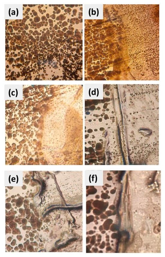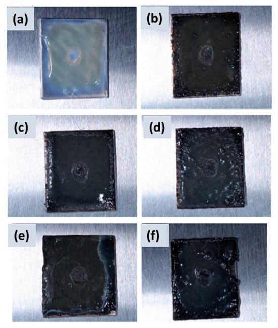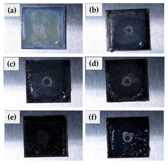 Images of the inhibition evaluation of the direct contact of a CuSe nanostructured coating: (a) 0, (b) 0.5, (c) 1.0, (d) 1.5, (e) 2.0, and (f) 3.0% wt. with Escherichia coli strain.
