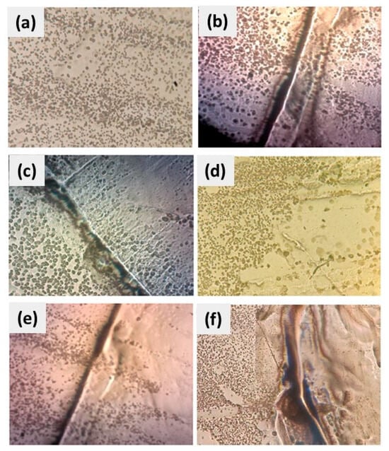 Figure 12 presents nanostructured CuSe coatings inoculated with Candida albicans studied under the same conditions as the bacteria Escherichia coli. The substrate without CuSe NPs, illustrated in Figure 12a, presented characteristics similar to those observed in Figure 11a, that is, a yellow coloration and a white halo at the inoculation site. The substrates with CuSe NPs (Figure 12b–f) also presented a white halo with greater intensity that indicates microbial growth exclusively in the inoculation zone.