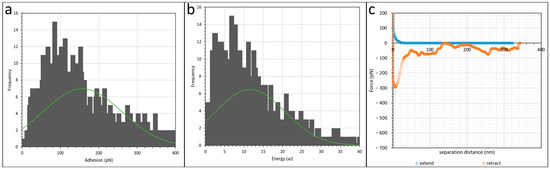 The effect of polyacrylamide charge density on its interaction with calcium carbonate was investigated by comparing between two HPAMs of similar molecular weights, namely F3330 (30% hydrolysed) and AN910 (10% hydrolysed). The AFM scan procedure was similar as in the previous section. The average and peak values of adhesion and interaction energy from scans on AN910 are tabulated in Table 2. Histogram and green normal distribution plots along the most recurring force–distance curve for the interaction of AN910 are displayed in Figure 5. The force mapping results of F3330 were mentioned in Section 3.1.