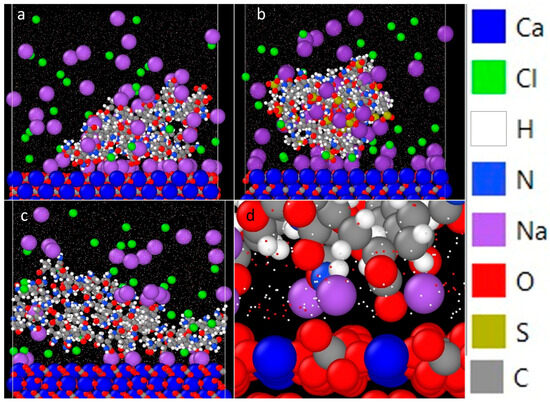 Snapshot of the adsorption equilibrium of (a) HPAM 33%, (b) SPAM 33%, and (c) NPAM onto calcite in the presence of NaCl; and (d) detail of the positioning of Na ions (purple) between O group (red) of polyacrylamides and calcite surface. Legend for colour-coding the atoms in MD simulation is displayed on the right.