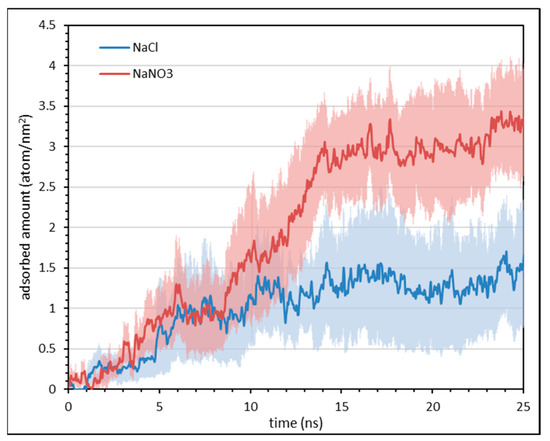 To further elucidate the phenomenon of salt bridging, the work of Al-Hashmi et al. [67] on the effect of salt ion bare and hydrated radii on the facilitation of salt bridging between polymer and surface was referred. In their work, they discovered that the amount of salt bridging increased when the salt cations’ bare radii increased and hydrated radii decreased. Thus, 3% NaCl was replaced with equimolar of NaNO3 (4.36 wt%), where the hypothesis is that the NO3− should be a more effective salt bridging ion than Cl−, since NO3− has a larger bare radius and a smaller hydrated radius than Cl−. Both AFM force mapping and MD simulations were conducted to test this hypothesis, and the results are compiled below. The compilation of histogram values from AFM force mapping in Table 4 shows that the average and peak adhesion and interaction energy values of AN910 with calcite under NaNO3 are higher than that in NaCl. For MD simulation results presented in Figure 7, the polymers were allowed to equilibrate for 30 ns, where the adsorbed amount is taken as the number of atoms on the polymer molecule adsorbed on the surface (1 nm2) with the average of the data points from the last 5 ns. These results demonstrate that the NPAM molecules are able to approach closer to the calcite surface in the presence of NO3−, which are the brown (N) and yellow (O) ions in Figure 7, than in Cl−, represented as green ions. This is further corroborated by the results shown in Figure 8, in which the MD simulations indicated that the adsorbed amount of NPAM onto calcite surface in NaNO3 at equilibrium is higher than in NaCl, with values of approximately 3 atoms/nm2 ± 0.67 and 1.5 atoms/nm2 ± 0.62, respectively, for NaNO3 and NaCl. A density distribution analysis of the atom type representing the salt cation, anion, and polymer for their adsorption on the calcite surface was further evaluated in Figure 9, where the calcite surface is located at a distance of approximately 18 Å.