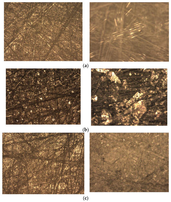 Microscopic results: (a)—POM filled fiber glass; (b)—POM filled graphite; (c)—POM filled silicon carbide.