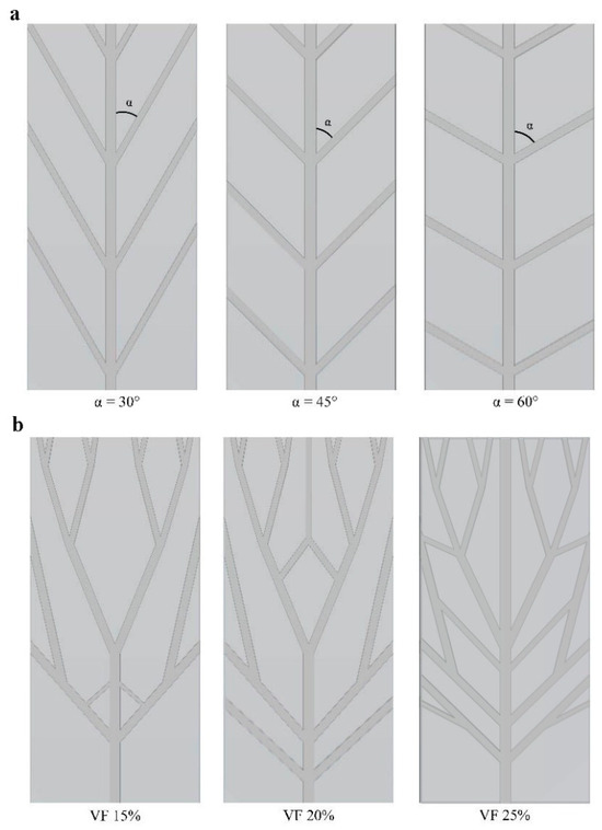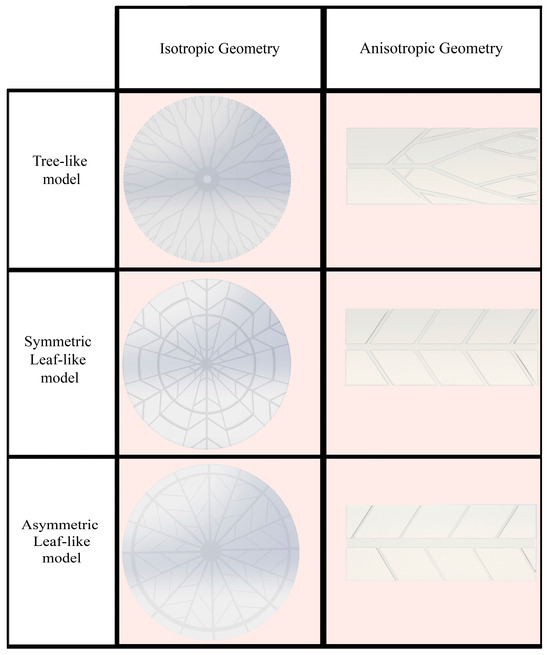 The escalating need for faster performance in electronic devices has recently posed a considerable challenge [29]. High performance generates excess heat, causing devices to overheat and malfunction. MCHSs, which operate relatively straightforwardly, were introduced to enhance heat removal from integrated circuits [30]. The generated heat of electronic equipment is transferred to the coolant fluid using the convection mode of heat transfer. In this case, by designing heat sinks made of SMP, an attempt is made to pronounce the cooling process. Also, these structures can improve the thermal properties of SMPs. This research aims to reduce the shape recovery time and, thus, improve the response of the SMP structure to heat. Two types of structures were designed: isotropic and anisotropic structures. As shown in Figure 1, anisotropic structures have a rectangular shape as well as unevenly distributed heat and fluid flow, and isotropic structures have a circular shape in which fluid flow and heat are uniformly distributed. Depending on the preferred cooling application, any designed structures can be used. As mentioned, the initial design idea was based on the plant’s water supply system. The models’ representative volume element (RVE) was based on the structure dimensions represented by Wang et al. [28]. As shown in Figure 2, the geometry of the models is divided into three general types: tree-like, symmetric leaf-like, and asymmetric leaf-like, and each model is designed by three volume fractions (VFs) of embedded branches: 15%, 20%, and 25%. The asymmetric and symmetric models were designed with three angles: 30°, 45°, and 60°. As Wang et al. [28] suggested, some geometrical parameters need to be defined for the design of networks to obtain an appropriate comparison. The two following conditions were utilized: