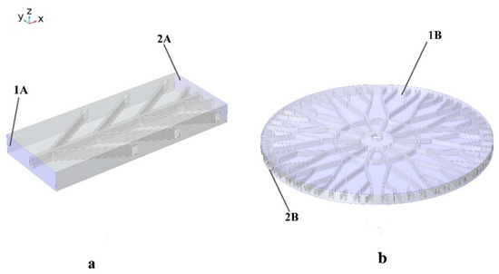 In both approaches, the constant heat flux is prescribed along the top and bottom walls of the structures while the other lateral wall’s initial temperature is set to 293.15 K. Approach B considers the fluid flow in microchannel branches, while the temperature of the moving fluid impacts the structure’s temperature. The heat transfers in structure for approach A’s equation for a solid material with heat flux convection can be represented as follows: