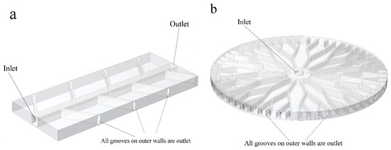 Fluid flow inlet and outlet; (a) Fluid path in anisotropic SMP structure and the (b) fluid path in isotropic SMP structure. All outer grooves are outlets.