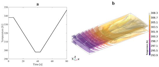 where ,, , and are the temperature-dependent fluid properties described in Table 2. Here, F and represent the external force and heat generation applied to the fluid, respectively. Equations (11) to (13) are solved for the fluid velocity field , fluid pressure , and fluid temperature, T. Approach B uses 40,000 and 150,000 elements for anisotropic and isotropic structures, respectively. The tetrahedral mesh type is used for the fluid subdomain. First, an external mechanical tensile load is applied to the structure. When the fluid temperature is raised, a temperature gradient in the SMP is induced, which causes the SMP to revert to its initial shape. Also, to simulate the shape recovery of the structure due to fluid temperature, the fluid–structure interaction (FSI) module is employed. A pressure drop was created by setting the inlet boundary condition to 5 Pa and the outlet boundary condition to 0 Pa. The temperature profile applied to the water was modeled as a linear function, with a constant temperature gradient along the length of the microchannel networks. The temperature profile is shown in Figure 5a. The heat transfer across the interface between the solid and fluid domains was modeled using a convective boundary condition. The convective boundary condition considers the heat transfer due to the movement of the fluid. The temperature at the interface was set to match the initial temperature of the fluid domain. This boundary condition was used to model the non-isothermal flow of water around the SMP and its effect on the recovery time of the SMP. The lateral walls of these structures were initially set to a reference temperature of 293.15 K. However, due to heat transfer from the surrounding fluid, the temperature of the walls changed over time. The heat transfer process was incorporated into the thermal boundary conditions, resulting in a time-varying temperature profile for the lateral walls. Approach A is similar to approach B, except there is no fluid pressure into microchannels in SMP heat sinks. Therefore, no deformation is expected due to the fluid–structure interaction in approach A. Thus, as Figure 4 exhibits, all the examinations were accomplished with one inlet, and the remaining grooves on the structures’ outer walls were considered outlets. The Reynolds number was 45 at the inlet. Also, it is evident that the mechanical properties of SMPs are temperature-dependent, allowing us to capture material behavior changes as temperature varies.