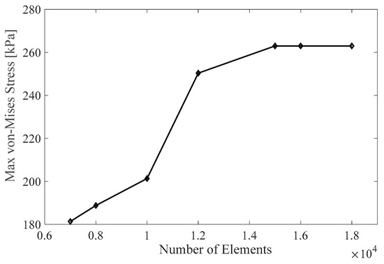 The results are divided into anisotropic and isotropic structures, with six sub-sections examining how the volume fraction, design angle, and usage approaches affect SMP structures’ response. The SMP model used in this study was validated based on the test results in our previous studies [31]. In the following multi-physics simulations, the results were checked independent of the mesh size and time steps. Figure 6 shows the correlation between the mesh size and maximum von Mises stress recovery for an asymmetric anisotropic model. It illustrates the different mesh sizes used, ranging from extra coarse to fine. The maximum element size is 3mm, and the minimum is 0.56 mm, with a growth rate of 1.6. The optimum mesh size for the simulation is approximately 15,000 elements, which was determined through a grid independence study using a tetrahedral mesh.